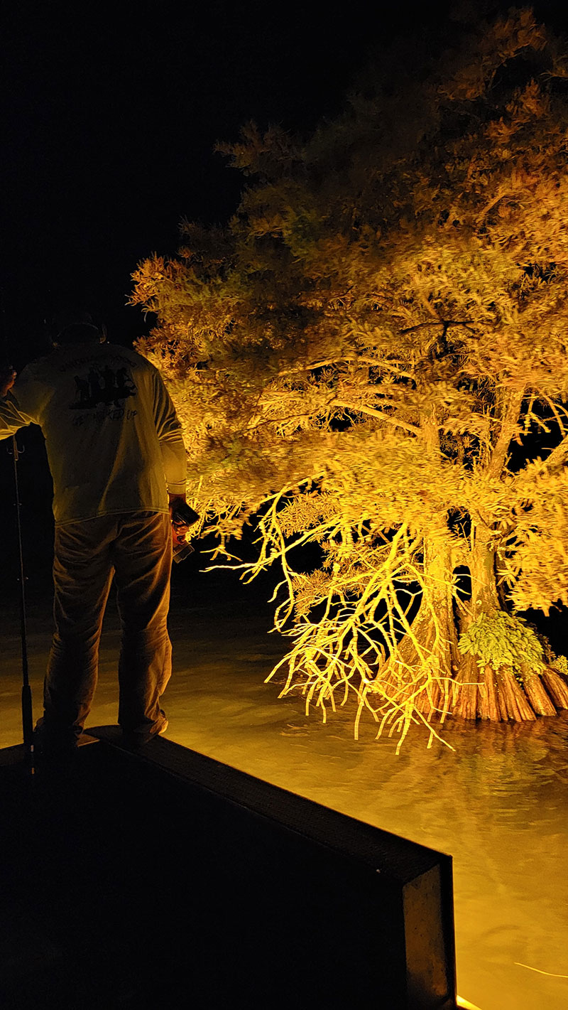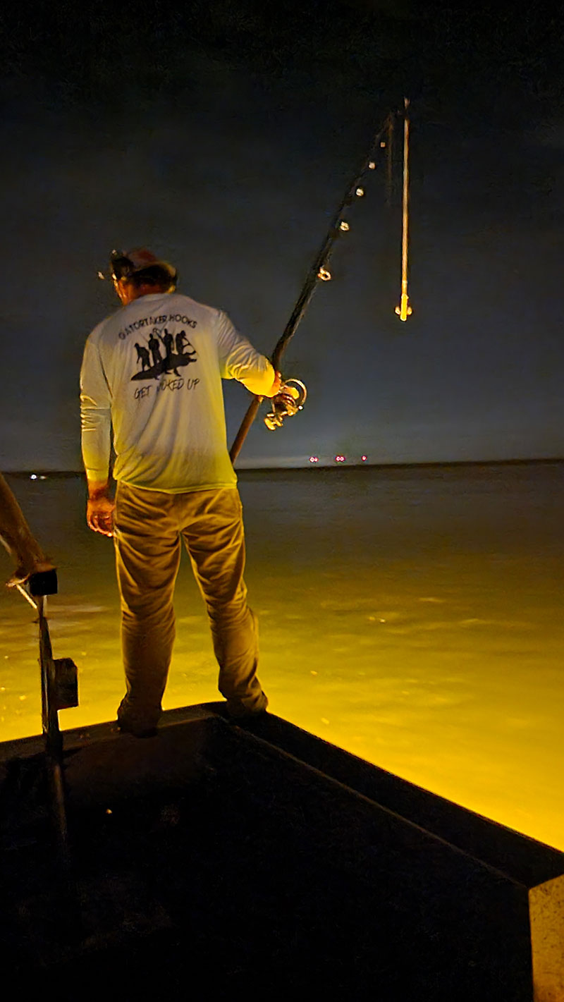 William Ard of Renegade Bowfishing stands ready with a stout rod and a snatch hook to add a second line to an already-hooked gator.