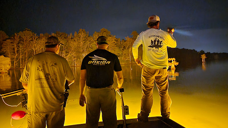 Brian Carroll stands by with a crossbow, ready to put a line in a gator while Cole Poplin steers the boat and William Ard scans the water.