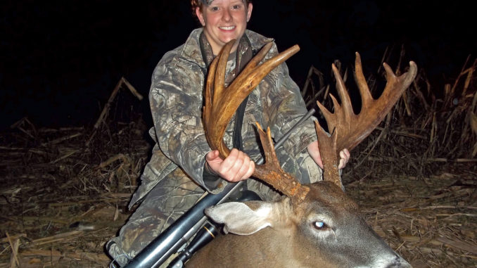 “He’s a monster; I was glad to get him,” said Mills, who put a single round from her Remington 7mm-08 through the buck’s shoulder, dropping him in the middle of an L-shaped cut cornfield she was watching.