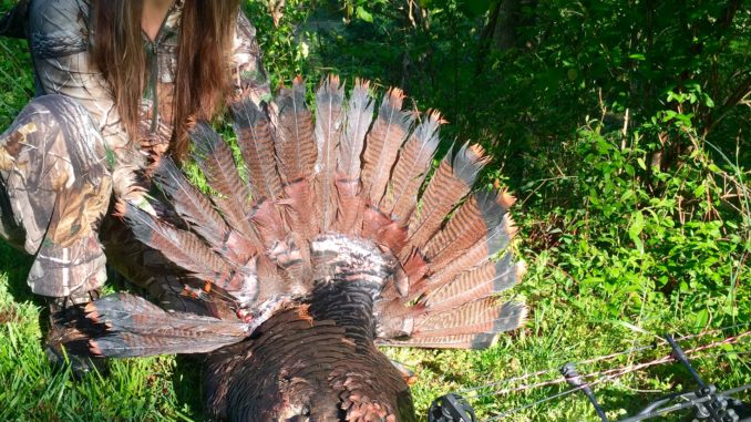 “The tom I had my eye on was 23 yards and angled slightly. I let my arrow go, and this time, it hit the tom,” she said. “He immediately flushed up in the sky, with that arrow still stuck in him.”